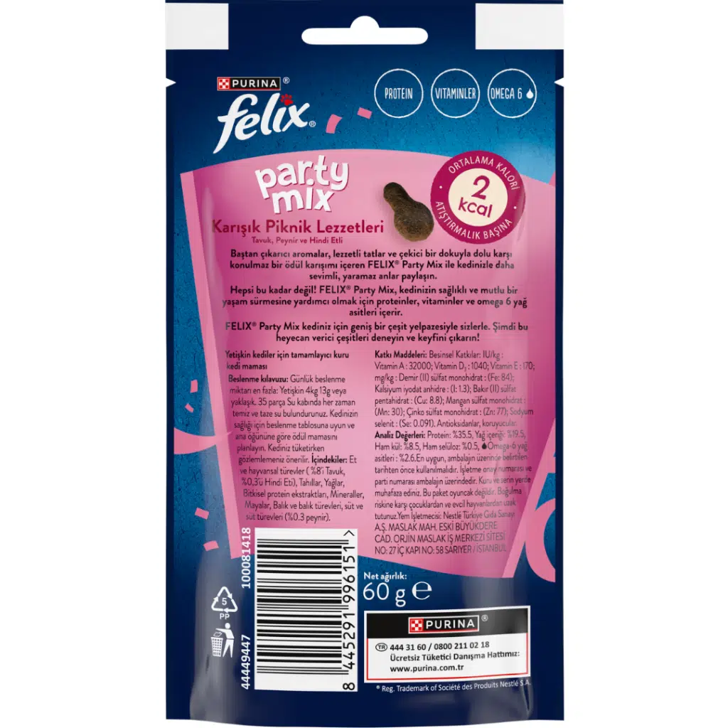 Kedinizle daha sevimli ve yaramaz anlar paylaşmak için Felix Party Mix kullanın, baştan çıkarıcı aromalar, lezzetli tatlar ve çekici bir dokuyla dolu, karşı konulamaz bir ödül karışımı içerir. Hepsi bu kadar değil! Felix Party Mix, kedinizin sağlıklı ve mutlu bir yaşam sürmesine yardımcı olmak için proteinler, vitaminler ve omega 6 yağ asitleri içerir. Felix Party Mix kediniz için geniş ürün yelpazesiyle sizlerle. Şimdi bu heyecan verici çeşitleri deneyin ve keyfini çıkarın!