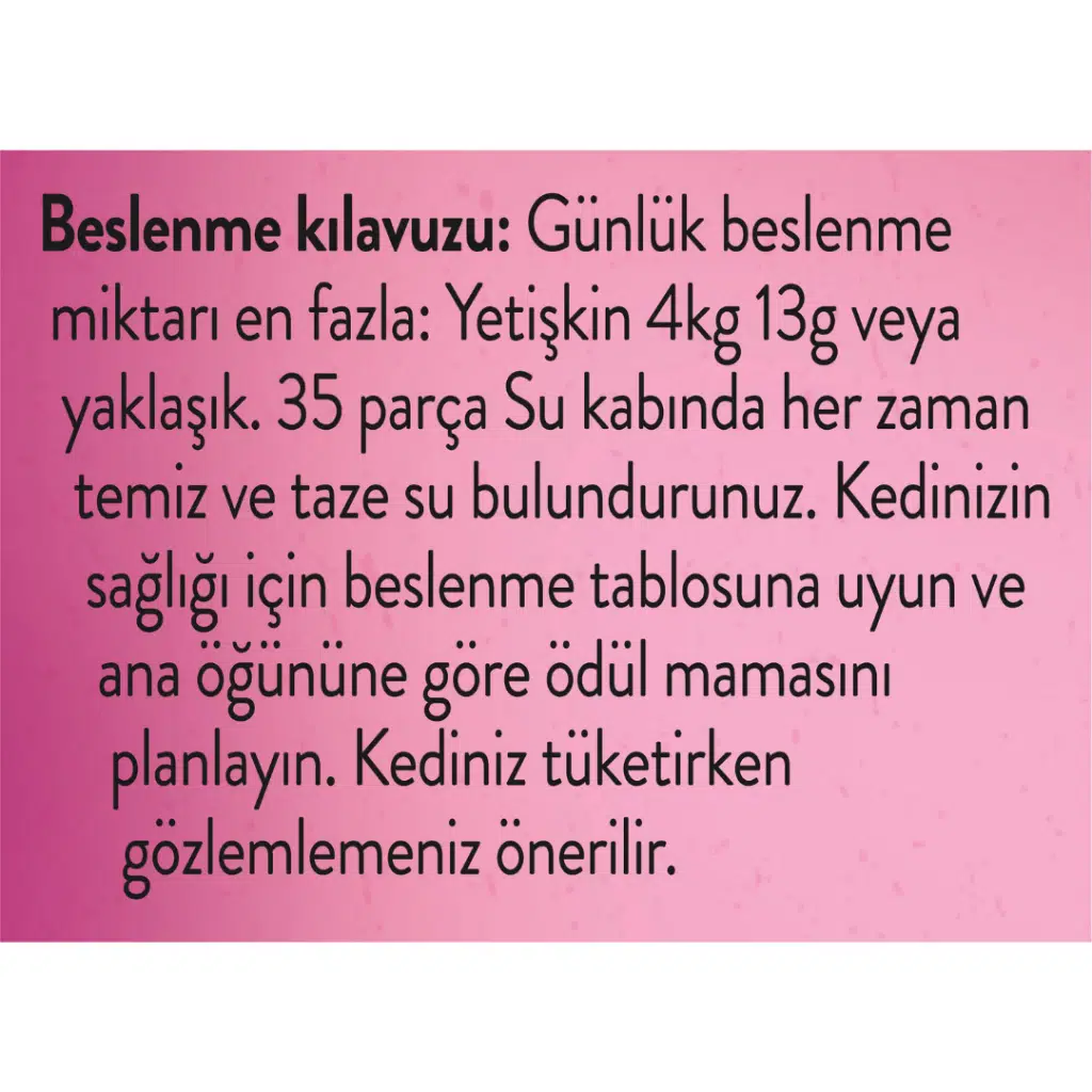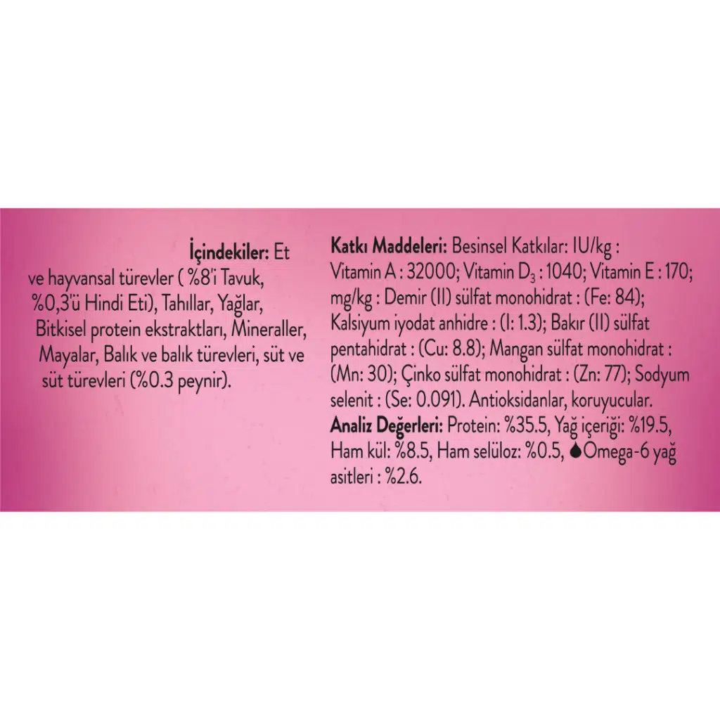 İçerik : Et ve hayvansal türevler %8.00'i Tavuk, %3.00'ü Hindi Eti, Tahıllar, Yağlar, Bitkisel protein ekstraktları, Mineraller, Mayalar, Balık ve balık türevleri, Süt ve süt türevleri %0.30'ü peynir.