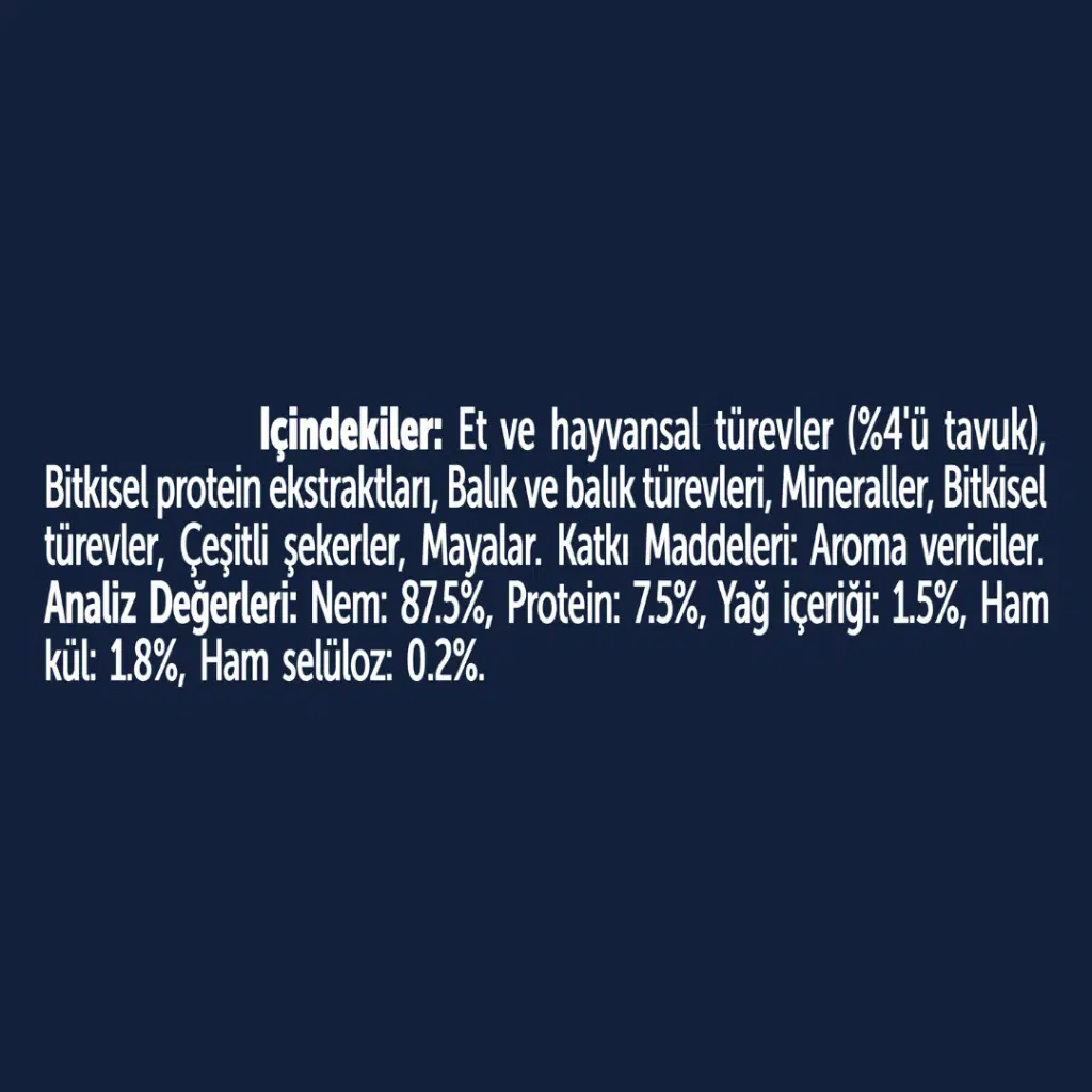 İçerik : Et ve hayvansal türevler %4.00 Tavuk, Bitkisel protein ekstraktları, Balık ve balık türevleri, Mineraller, Bitkisel türevler, Çeşitli şekerler, Mayalar.