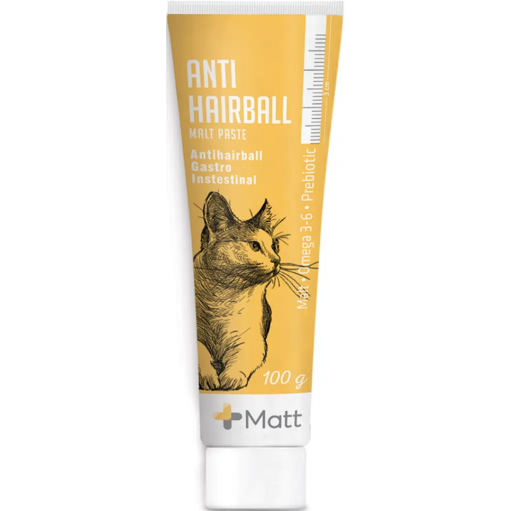 Kediler tüylerini yalayarak temizlediğinde, midede tüy yumağı oluşturabilir. Bu, sindirimde bozukluklara yol açarak kusma, tıkanıklık veya ishalle sonuçlanabilir. Ayrıca, yeterince egzersiz yapmayan kediler tıkanıklıklara eğilimlidir ve Matt Anti Hairball Malt Paste bu durumlarda yardımcı olacaktır. Matt Anti Hairball Malt Paste iştahı arttırır ve bu nedenle hasta olan veya başka nedenlerle iştahı azalan kediler için uygundur.
